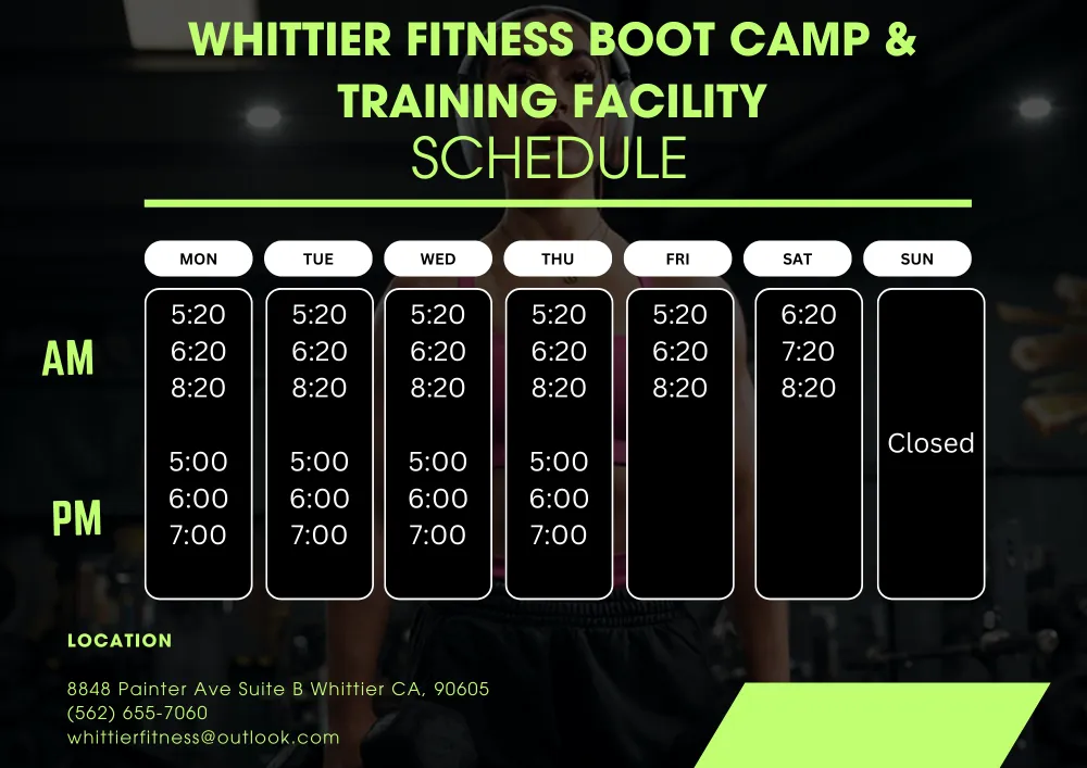 At Whittier Fitness, we know life gets busy. That’s why we offer a variety of high-energy HIIT Bootcamp and Metabolic Conditioning sessions from morning to night. Whether you’re an early riser or a night owl, our 30-minute "Afterburn" workouts are designed to fit your schedule and deliver maximum results in minimum time.